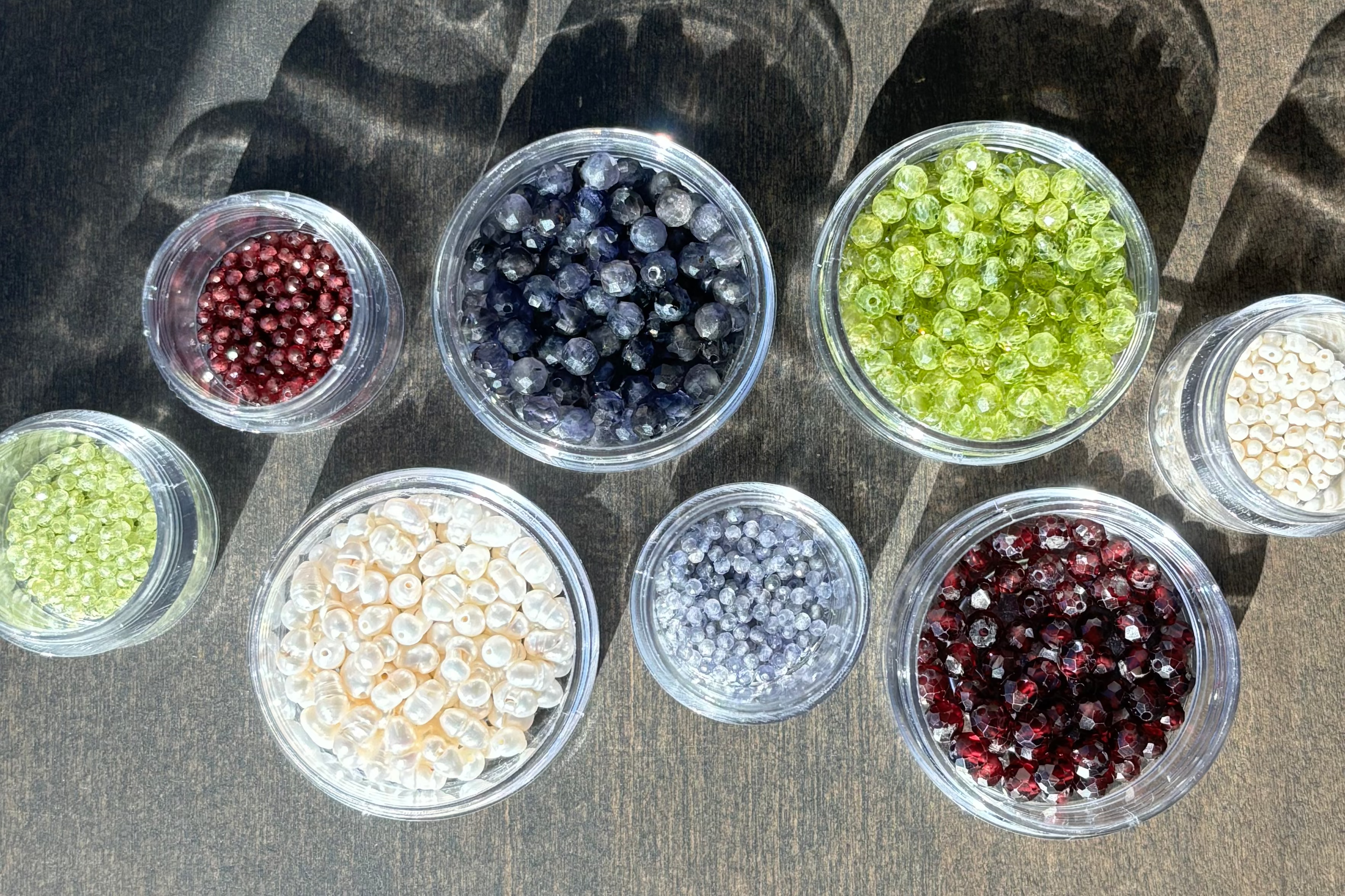 I wanted to create something intentional and timeless, capturing both the calm of the changing season and the excitement of what’s ahead. The color palette, drawn from a clear evening sky, combines the warmth of garnet, the cool tones of iolite and peridot, and the soft glow of freshwater pearls, all set in 14k gold fill or sterling silver.